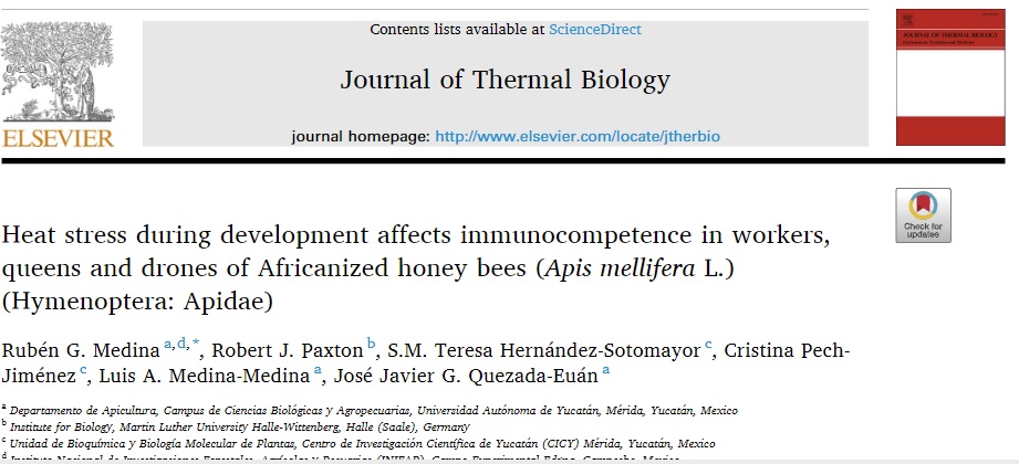 Medina R.G., Paxton R.J., Hernández-Sotomayor S.M.T., Pech-Jimenez C., Medina-Medina L.A., Quezada-Euán J.J.G. (2020) Heat stress during development affects immunocompetence in workers, queens and drones of Africanized honey bees (Apis mellifera L.) (Hymenoptera: Apidae). Journal of Thermal Biology 89: 102541 https://doi.org/10.1016/j.jtherbio.2020.102541